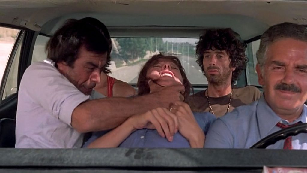 As the story progresses, the thieves become fugitives and kidnappers on the run from the law. Led by “Doc” (Maurice Poli), the delinquents navigate through various challenges, such as running out of gas, encountering manned toll booths, and facing unforeseen obstacles, including the two psychopaths “Blade” and “ThirtyTwo” in the backseat tormenting Maria (Lea Lander). Despite the change in pace from the film’s first fifteen minutes, Rabid Dogs maintains its tension as the group yearns to make a clean getaway.