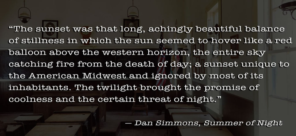 The summertime invokes so many childhood memories of waiting for that final school bell to chime, signaling the end of the school year and the beginning of freedom that the summertime brings. Dan Simmons’ Summer of Night takes place in the summer of 1960 at the end of the school year and the end of Old Central School which is slated to be demolished. The boys and girls of Elm Haven, Illinois are in for quite the surprise as there is a terror unleashed in town hellbent on making sure the townsfolk have anything but a pleasant time off from school or work. No one in Elm Haven is safe.
